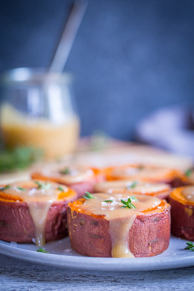 Roasted Sweet Potatoes with Tahini Maple Butter