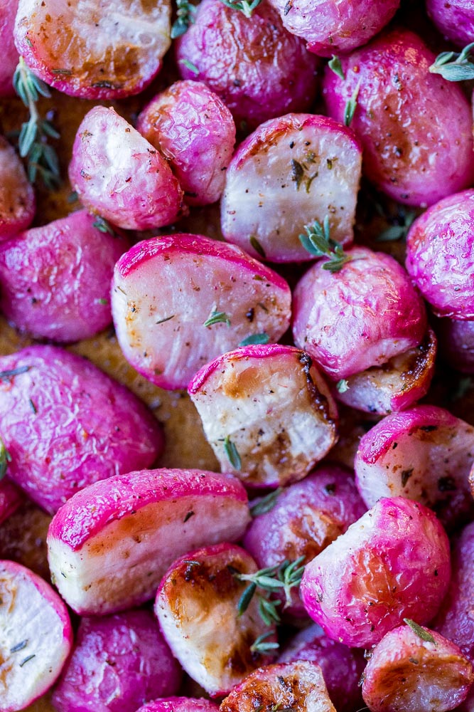 Roasted Radishes are a great, healthy, low-carb side dish that tastes similar to potatoes. I roasted them with garlic and fresh herbs, and they’re so delicious (without a strong radish taste).
