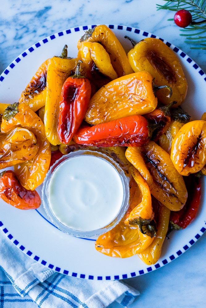 These Roasted Sweet Peppers are a quick, easy, healthy appetizer everyone will love. They’re served with a creamy goat cheese dip that makes them even more special.