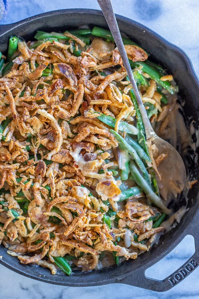 This Vegan Green Bean Casserole is creamy, flavorful, and topped with delicious crispy onions! It’s easy to make and perfect for your vegan Thanksgiving this year.