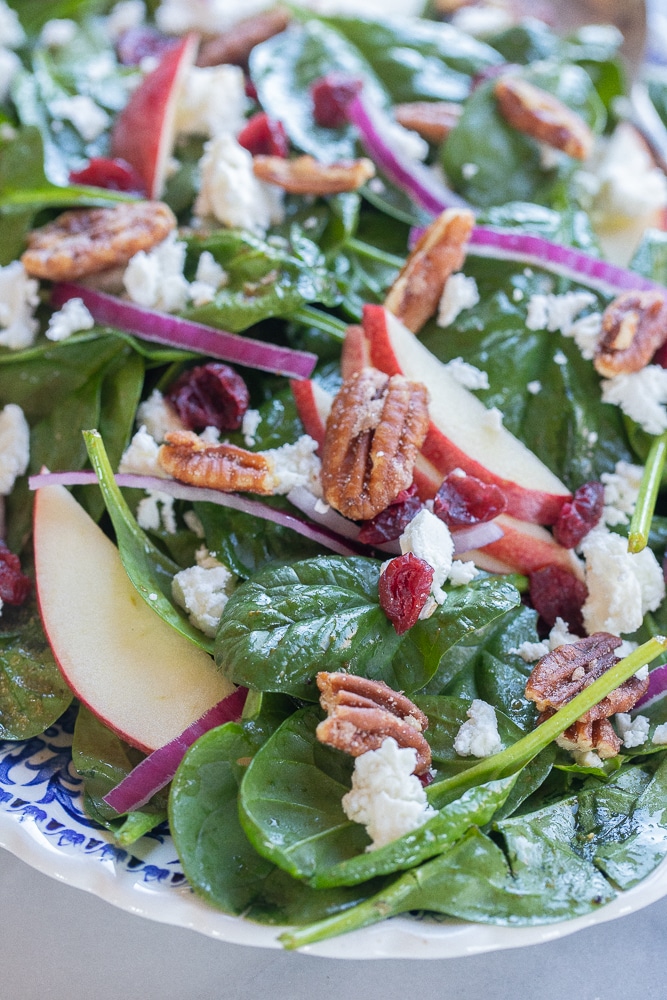 Looking for a simple, veggie-centric side dish for Thanksgiving that doesn’t require an oven? This Easy Spinach Salad can be thrown together in about 10 minutes and is packed with nutrients. It’s a great everyday side dish to accompany lunch or dinner that’s also special enough for the holiday table.