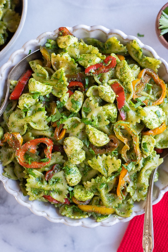 This red and green Holiday Pesto Pasta Salad is a perfect, make-ahead recipe that can be enjoyed warm or chilled. This simple yet flavorful pasta salad is packed with tangy balsamic sweet peppers and creamy mozzarella pearls. This festive salad is perfect for a Christmas or New Year’s potluck.