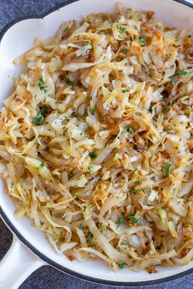 My mouthwatering Sautéed Cabbage recipe is easy to make and only requires a few ingredients. This caramelized cabbage is packed with flavor and goes great alongside your favorite meat(free) and potato dish or as a side on St. Patrick’s Day. This might not be the most glamorous-looking side dish, but it’s always a hit!