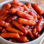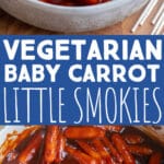 My Baby Carrot Little Smoky recipe is a meat-free version of the classic little smoky recipe, which is beloved by many. I use baby carrots in place of sausages and they work so well. Not only are they the perfect shape for this vegetarian copycat recipe, but they also, naturally, have a sweet and earthy taste to them. The roasted carrots then get tossed with a sticky bbq sauce for maximum flavor. Serve as a holiday side dish, or a tasty appetizer that everyone can enjoy.