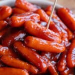 My Baby Carrot Little Smoky recipe is a meat-free version of the classic Little Smoky recipe, which is beloved by many. I use baby carrots as a substitute for sausages, and they work exceptionally well. Not only are they the perfect shape for this vegetarian copycat recipe, but they also, naturally, have a sweet and earthy taste to them. The roasted carrots then get tossed with a sticky BBQ sauce for maximum flavor. Serve as a holiday side dish or a tasty appetizer that everyone can enjoy.