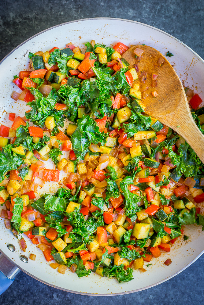 - Preheat the oven to 400 degrees F. Heat a large pan over medium heat and add olive oil, onion, red pepper, zucchini, salt, pepper, and spices. Cook for 7 minutes, then add kale and cook for another 2 minutes.