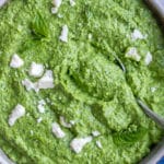 With Easter just around the corner, spring is almost in full swing. I’ve been craving fresh flavors and am so happy to finally see some green leaves poking through the surface of the ground. I’ve been adding baby spinach leaves to my pesto recipes for a long time. It’s a great way to stretch the amount of basil you have and get your healthy greens in. This Basil Pesto with Spinach and Feta Cheese is bright, flavorful, and creamy. It’s my new favorite pesto recipe and goes great with pizza, pasta, sandwiches, and more.