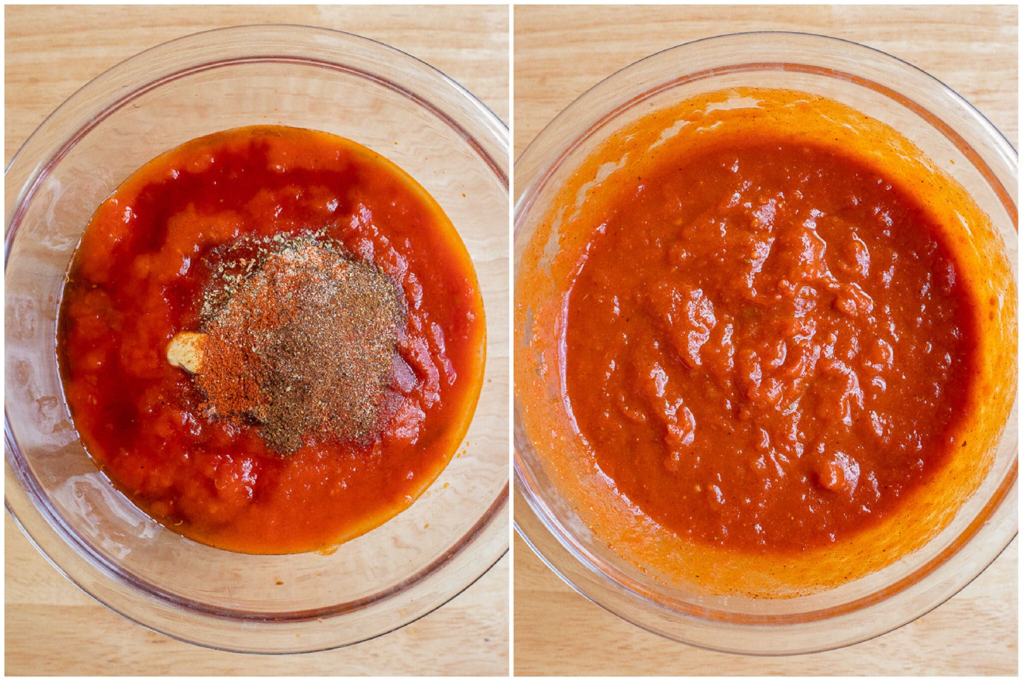 - Prepare any toppings needed beforehand. Add all the bbq sauce ingredients to a medium sized bowl and whisk until completely combined. Set aside until ready to use. If you want a silky smooth bbq sauce, you can blend it up to get rid of any chunks of tomato from the marinara sauce.