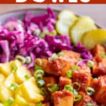 - Optional bowl ingredients: Rice, pineapple, pickles, coleslaw, green onion, extra bbq sauce, cucumber, avocado, black beans, hot sauce