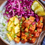 School is starting back up soon, and I’m not at all ready for summer to be over. I know it lasts until late September, but it feels a bit different once the kids return to school. If you’re like me and clinging to summer, you’ve got to try my fresh and flavorful BBQ Tofu Bowls. They’re smoky, sweet, and so filling. I like to customize mine with rice, crunchy cabbage, pineapple, and tangy pickles. These plant-based bowls can be enjoyed for lunch or dinner.