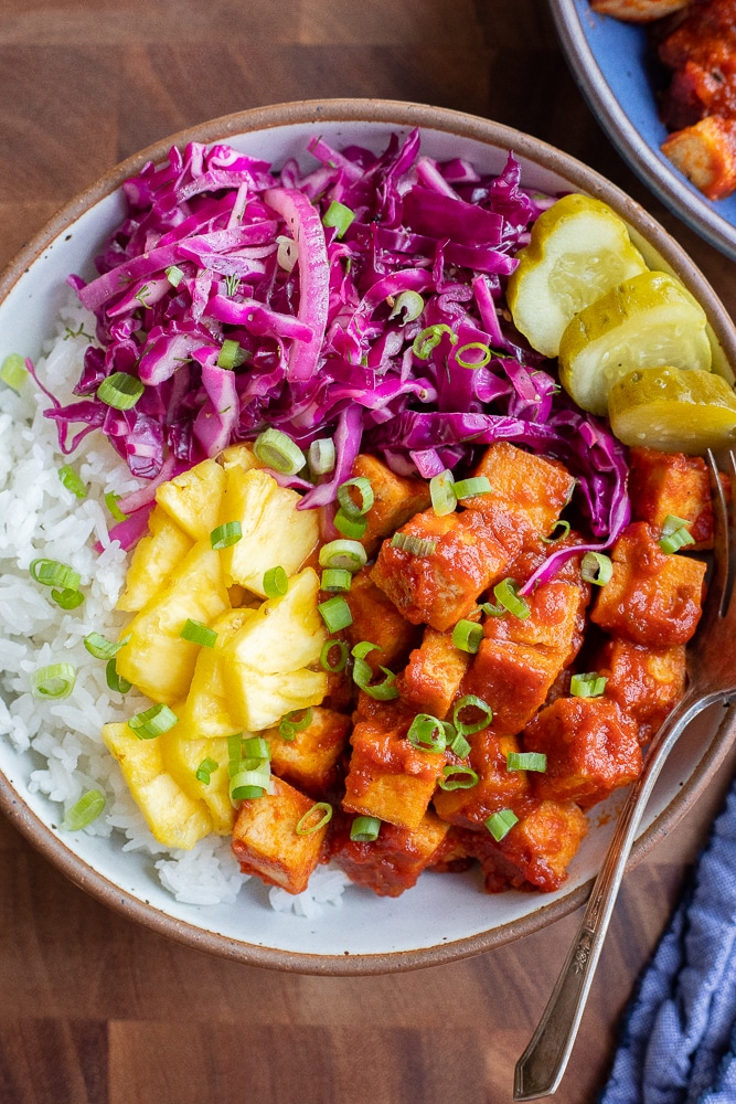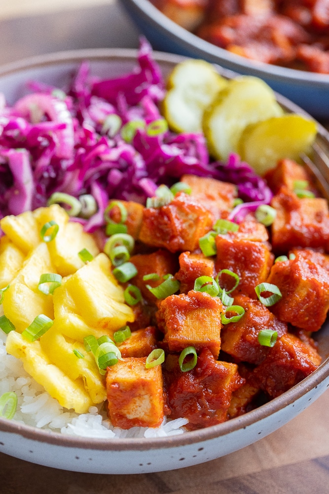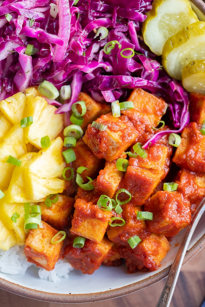 - Packed with flavor – The homemade BBQ sauce packs so much flavor and really makes the tofu shine. I also love adding crunchy cabbage, pickle slices, and fresh pineapple for even extra flavor.