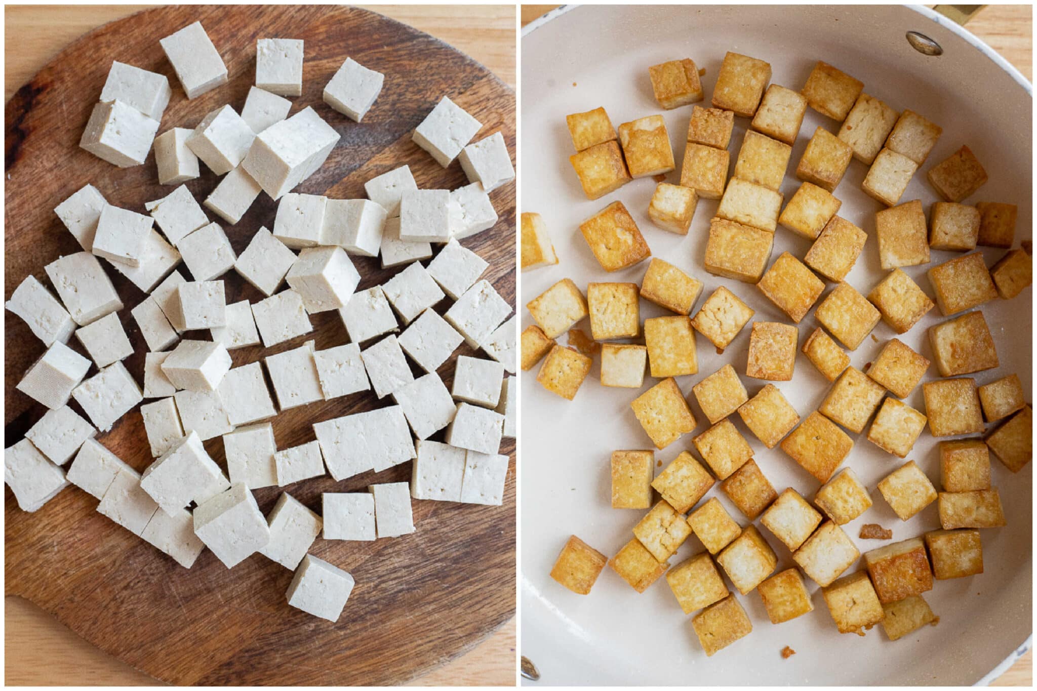 - Press tofu, if needed, and then dice it up into bite sized pieces. You can also use your hands to break it into chunks, if you prefer that texture. Heat a large pan over medium heat and add 1 1/2 tablespoons olive oil. Once oil is hot, add in the cubed tofu and toss to make sure all the tofu is coated with oil. You can also add in a drizzle of tamari, or a pinch of salt at this time, for extra flavor.