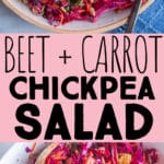 This Beet and Carrot Salad with Chickpeas is packed with color, flavor and lots of healthy ingredients! The vegetables add tons of vitamins and nutrients and the chickpeas provide protein. Enjoy this vibrant veggie salad as a side dish or serve with quinoa for a filling lunch or dinner.
