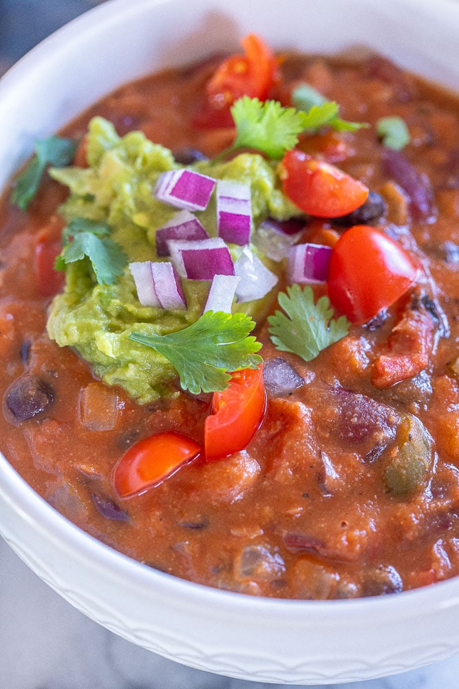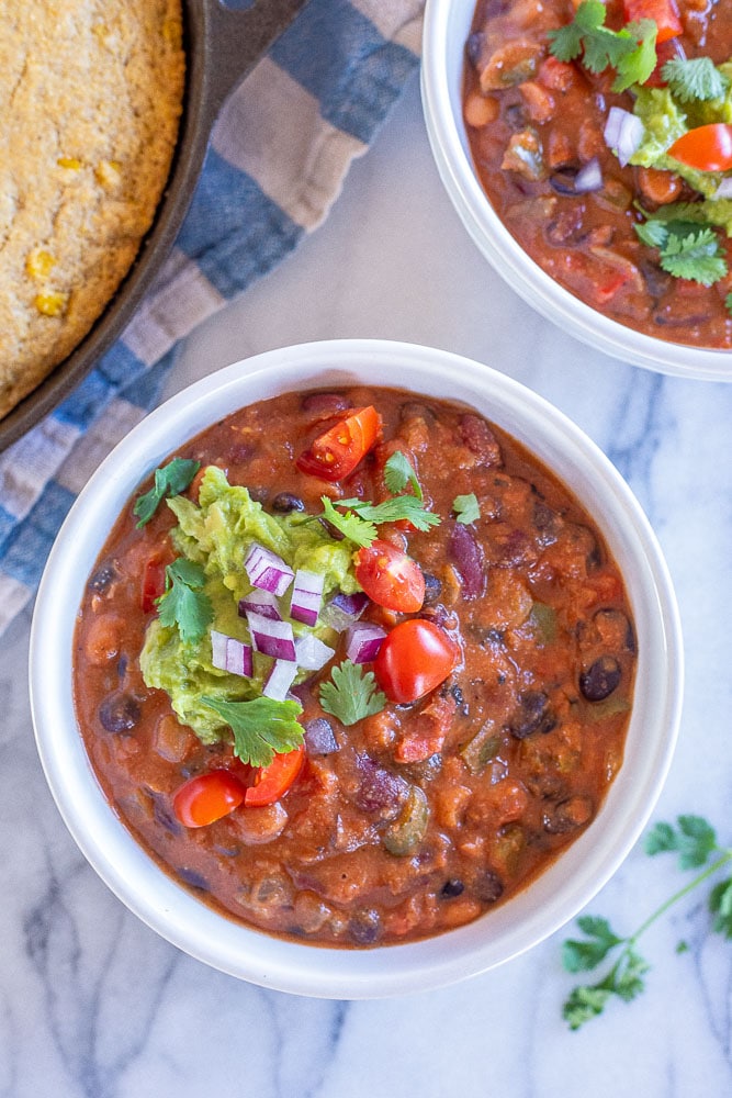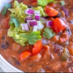 This Vegan Chili is thick and delicious! Load it up with your favorite toppings for an easy and hearty weeknight meal!