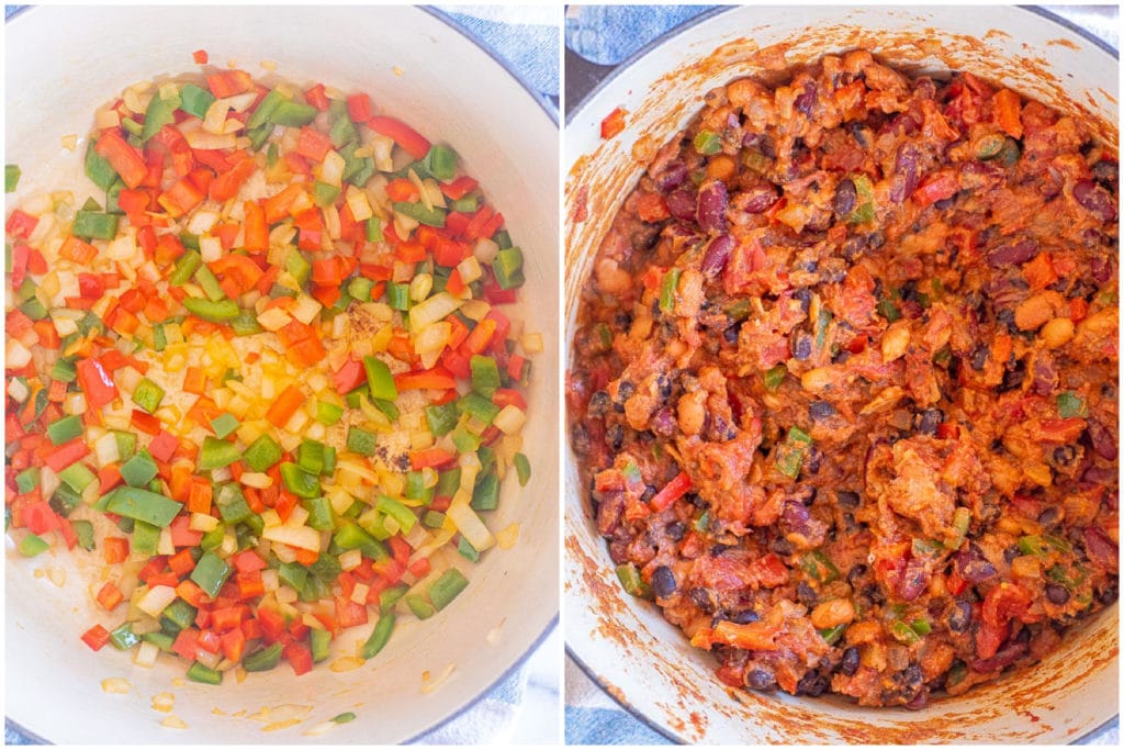 - Heat a large pot over medium heat and add olive oil and onion. Cook until soft, 2-3 minutes, and then add garlic and bell peppers. Cook for another 5 minutes.