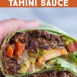 - Carefully roll wrap up. You can put it in a hot pan with some oil for a minute to help seal the bottom of the wrap, if desired. Cut wrap in half and enjoy! The wraps can also be dipped into the tahini sauce as you eat them 🙂