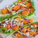 - Optional Toppings – You can top these buffalo tofu lettuce wraps with anything you like. I used thinly sliced celery, carrots, red onion, avocado, and cucumber. I also added some feta cheese or blue cheese and some ranch dressing. Let me know if you have questions about what to top yours with!