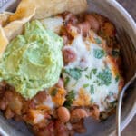 This Cheesy Green Chile Pinto Bean recipe is cozy and flavorful. These delicious beans are a great one pan vegetarian meal that can be enjoyed in many different ways. Serve as a side dish or as the main course, along side chips or corn tortillas, with your favorite toppings. Each serving boasts 26 grams of protein, so you’ll be satisfied for hours after eating.