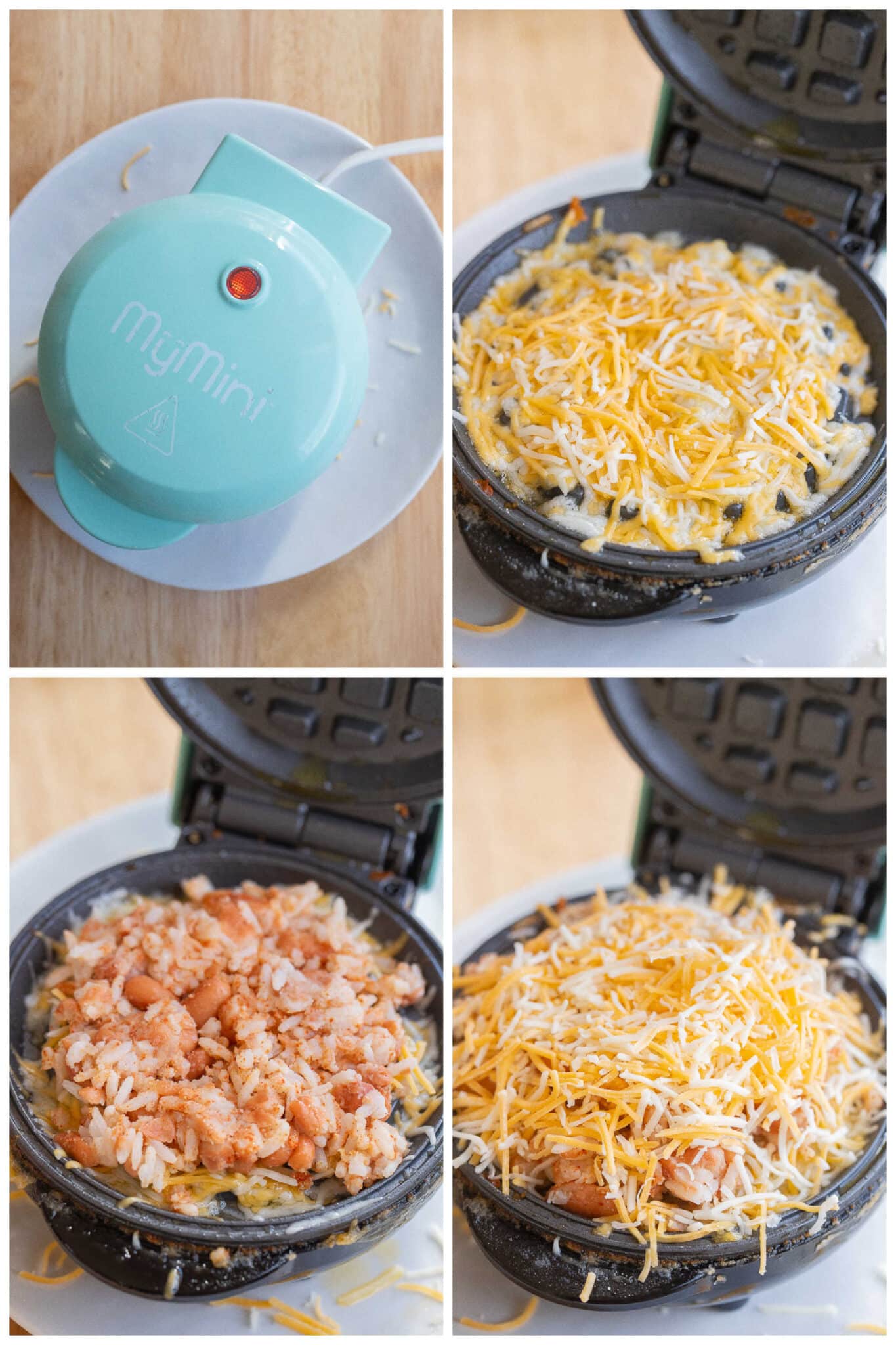- Turn on the waffle maker. Once it is heated up, spray the top and the bottom with cooking spray. To the bottom of the waffle maker, add about 1 tablespoon shredded cheese. Then top 1/4 cup of the rice and bean mixture, spread in an even layer, and lastly top with 1 more tablespoon of shredded cheese.