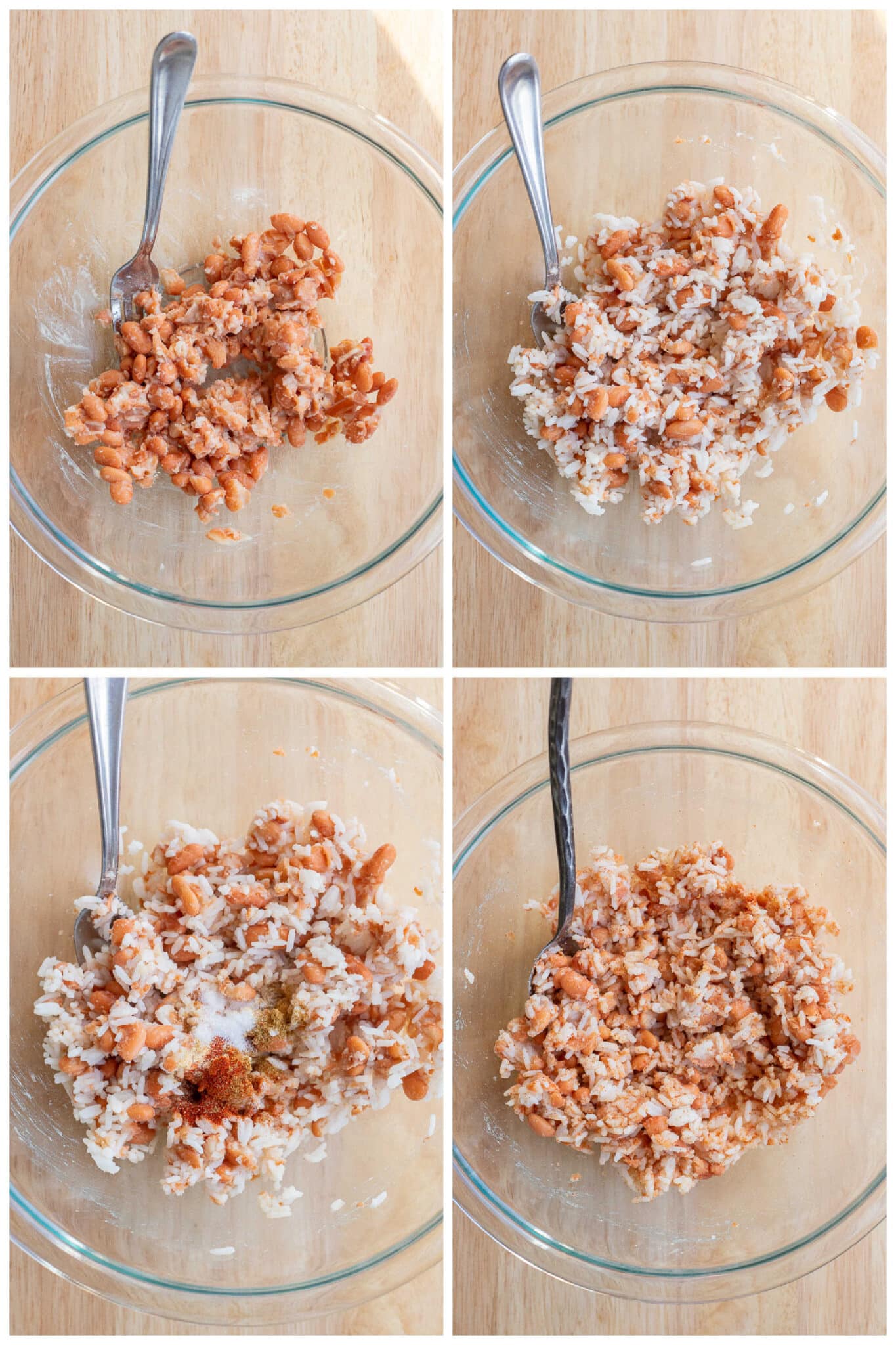 - Add the beans to a medium-sized bowl and use a fork to mash about half of them (optional). Next, add the cooked rice, paprika, cumin, garlic powder, and salt. Mix everything together well.