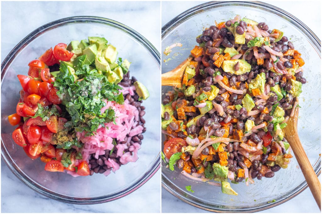 - Let the sweet potato cool, and then add it to a large bowl. Next, add in the black beans, tomato, avocado, pickled onions, cilantro, olive oil, cumin, lime juice and season with salt to taste. Mix everything together and enjoy!