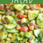 - To a large bowl, add the sliced cucumber, tomatoes, red onion, avocado and chickpeas. Pour the dressing over the salad and mix everything together well. If desired, mix in some extra chopped fresh cilantro before serving. Serve salad immediately or chill in the refrigerator until ready to serve.