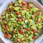 This Cilantro Lime Cucumber Salad with Avocado is easy to throw together, flavorful and refreshing! The cilantro lime dressing is creamy and goes perfectly with the fresh cucumber, avocados and tomatoes. Chickpeas add some protein and nice texture to make this salad a little more filling. Enjoy as a summer side dish or stuff into a pita for a light lunch!