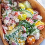 These Creamy Feta and Veggie Pitas are packed with tons of fresh garden veggies and soft, creamy feta cheese. Everything is tossed with a simple oil and vinegar dressing, which allows the vegetables to really shine. These pitas can be enjoyed for lunch with a side of chips or fries, or for a light end of summer dinner.