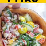 These Creamy Feta and Veggie Pitas are packed with fresh garden veggies and soft, creamy feta cheese. Everything is tossed in a simple oil and vinegar dressing, allowing the vegetables to shine. These pitas can be enjoyed for lunch with a side of chips or fries, or served as a light, end-of-summer dinner.
