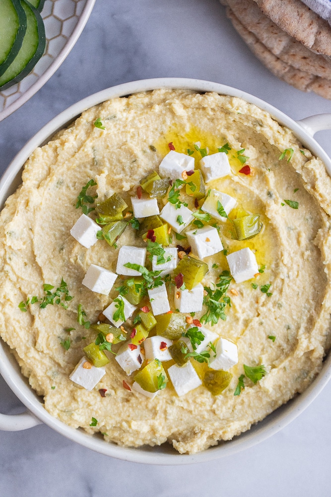 I was originally going to make a whipped feta-style hummus, but then, for some reason, the dill pickles popped into my head, and the flavors went so well together.