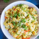 I’ve given up dairy for quite some time, so it wasn’t really too difficult for me, and a happy baby far outweighed eating cheese. Lately Eli has been SO much happier, so I’ve started to add dairy back into my diet slowly, and he seems to be doing well with it (knock on wood!). However, if you’re vegan and enjoy my recipes, don’t worry – I still love creating vegan recipes and will continue to do so. There will be just a few non-vegan options thrown in there. Enter, this Easy One-Pot Pasta Primavera!