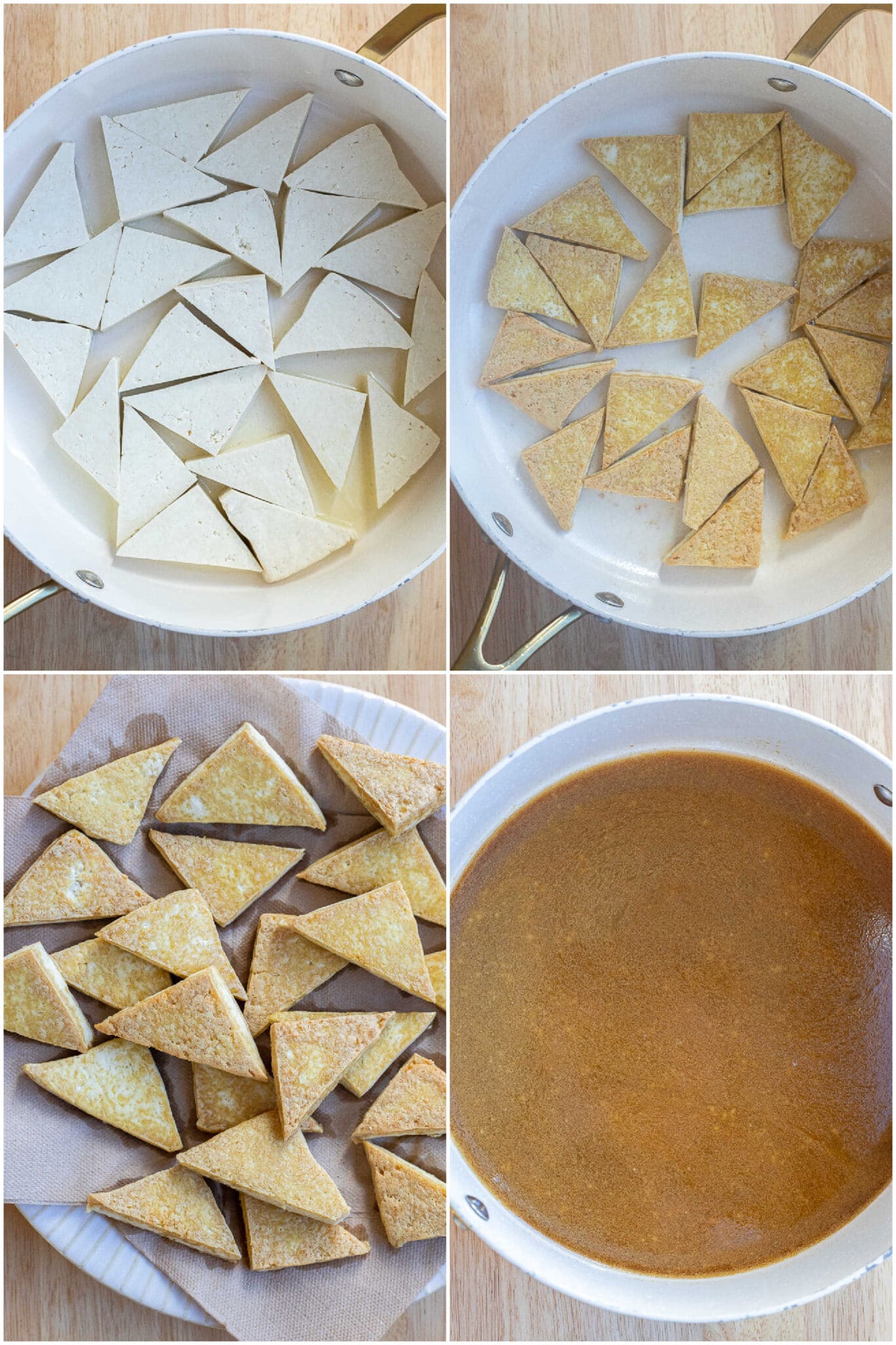 - Cut the tofu into triangles, or whatever shape you like. Heat a large skillet over medium heat and add the neutral flavored oil, you want it to be able to cover the bottom of the pan. Once oil is hot, add in the tofu in a single layer. Let tofu cook for about 4-5 minutes on each side, until golden brown and starting to get crispy.