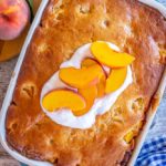 I originally baked this recipe in a round springform pan, which worked great. This time, I used a medium-sized baking dish, which was also perfect. Be sure to grease your baking dish well so your fresh peach cake doesn’t stick when removing it from the pan.