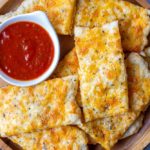 A lot of cheesy garlic bread recipes use an actual bread base, but I find this recipe is similar to the cheesy bread that you can order from a pizza place, which is my favorite kind. The bread is thin and loaded with cheese and garlic flavor, just the way I like it. It’s basically just like a pizza but with a few added ingredients and no sauce.
