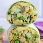 My Green Goddess Chickpea Wraps are filled with fresh vegetables, protein-packed chickpeas, and a flavorful tahini herb sauce. The chickpea salad can be made in advance, and you can assemble the wraps each morning for easy lunches throughout the week. Enjoy them with fresh fruit and chips for a healthy, plant-based lunch.