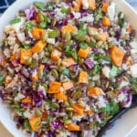 If you’re looking for a healthy, savory option to celebrate Halloween with this year, you’ve got to make my Halloween Salad with Rice and Veggies. It’s made using Halloween-colored ingredients and tossed with a fall-flavored apple cider vinegar dressing. Serve as a side dish at your Halloween party or bring for healthy and filling work lunches throughout the week.