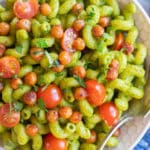 This Herby Lemon Jalapeno Pasta with Crispy Chickpeas is unique and flavorful. The herby green sauce is a little spicy and a little tangy and has a velvety texture. If you don’t like much heat, you can leave the jalapenos out, but they’re great for a nice little kick. I like to top my pasta with crispy, seasoned chickpeas and fresh cherry tomatoes for a nice bite.