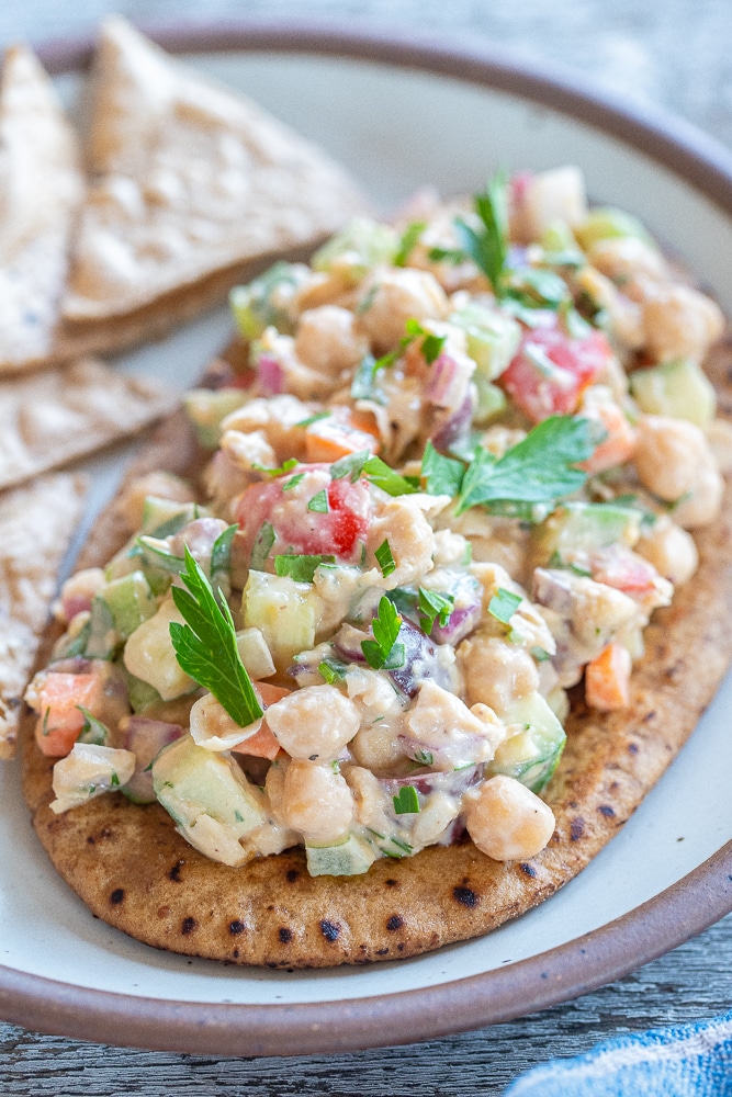 - Warm your pita and then top it with a few scoops the chickpea salad and enjoy! This chickpea salad can also be enjoyed by itself, with chips, crackers or even lettuce wraps!