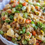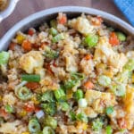 - Packed with veggies – Most fried rice recipes contain carrots and peas, but my version also has cauliflower, corn, onion, red pepper, broccoli, and edamame. I also like to top with green onion or cilantro for extra freshness.