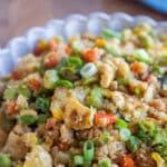 - Squeeze out the cauliflower rice – The addition of the cauliflower rice will add some extra moisture to this fried rice recipe, so I recommend placing riced cauliflower into a clean kitchen towel, wrapping it up, and squeezing as much liquid out of it as you can before adding it to the fried rice.