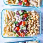 If you’re making this pasta salad for meal prep, I suggest assembling it in glass containers. I like these! Equally divide all the ingredients into the four containers, cover them, and store them in the refrigerator for up to four days. You can dress the salad while assembling it or store the dressing separately and dress it just before eating.