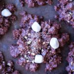 - Line a large baking sheet with a non-stick liner, or parchment paper. Scoop mixture into desired size cookies and top each one with a few marshmallows and sprinkle of graham cracker crumbs. It will seem like they’re falling apart but they will harden together once they cool. You can make the cookies whatever size you like. I used a 1/4 cup scoop.