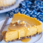This Vegan Pumpkin Cheesecake is creamy, full of flavor and so easy to make! It tastes just like regular cheesecake but is made with cashews and contains no dairy!