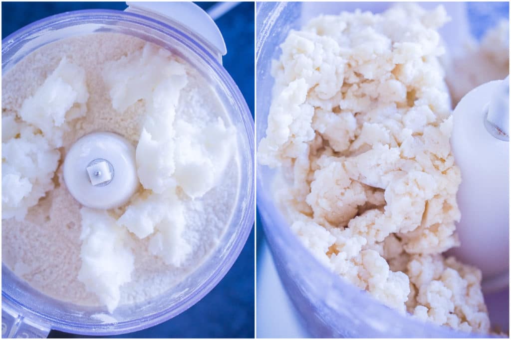 - Next, add the coconut oil and turn on the food processor and start adding tablespoons of ice cold water until a dough is formed. I used about 8 but it will depend on your dough so add slowly and stop the food processor to check consistency if needed.