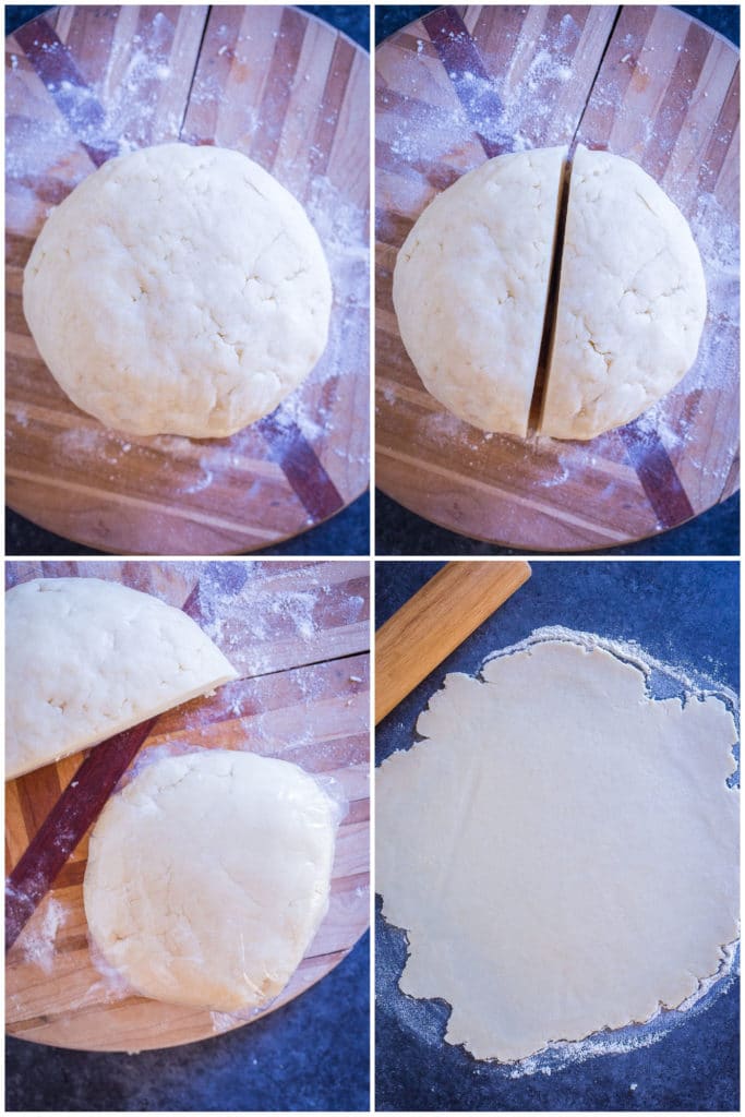 - Dump out the pie dough on a floured cutting board and use your hands to form into a ball. Cut in half and dough is ready to be used immediately.