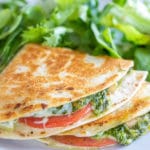 These easy Pesto Quesadillas are filled with white beans and tomato, making them a healthy vegetarian dinner recipe that takes only 15 minutes to make.