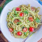 As you can probably see from the photo, I did add some regular whole wheat pasta into this recipe because as much as I love zucchini noodles, I still need a few carbs in my diet! But, you’re more than welcome to use just zucchini noodles or even just pasta. This Avocado Pesto will make anything taste great!