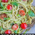 Adding the avocado to the pesto make it so creamy but also keeps these pesto zucchini noodles entirely dairy free, which is how I’m eating these days.