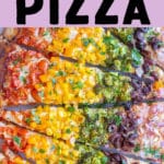 This Rainbow Vegetable Pizza is not only beautiful to look at, but it’s also super delicious and loaded with healthy vegetables. You can use whatever veggies you like, but this one is made with tomatoes, orange bell pepper, corn, broccoli, kalamata olives, and red onion. It’s fun to make with kids, and hopefully, it will convince them to try some new veggies.
