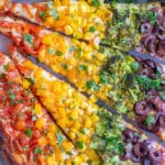 This Rainbow Vegetable Pizza is not only beautiful to look at, it’s also super delicious and loaded with tons of healthy vegetables! You can use whatever veggies you like, this one is made with tomato, orange bell pepper, corn, broccoli, kalamata olives and red onion. It’s fun to make with kids, and hopefully it will even convince them to try some new veggies!
